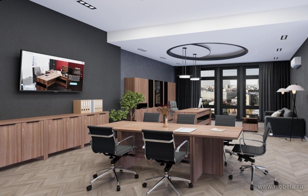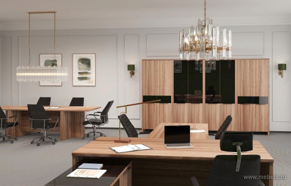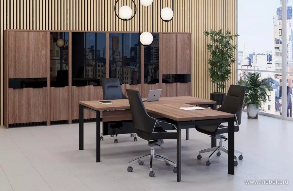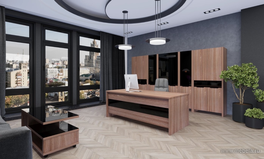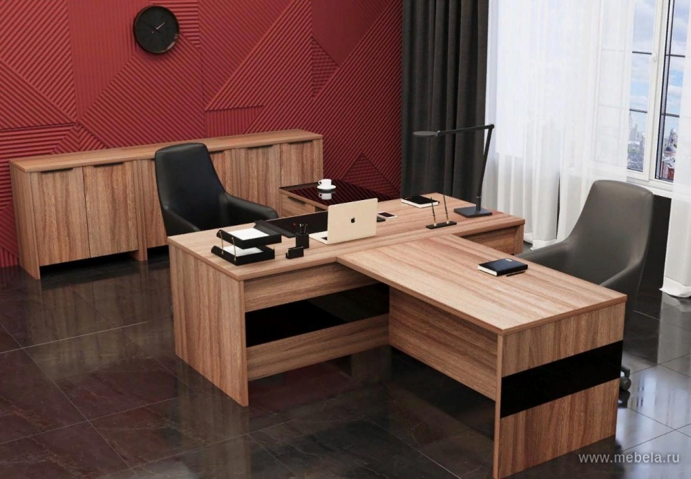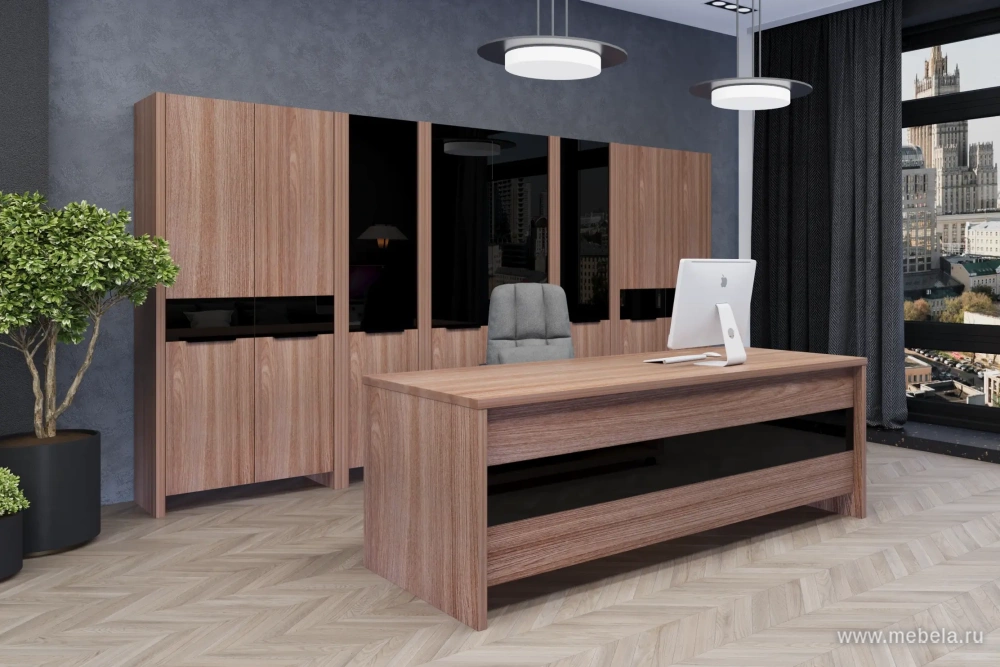 Кабинет руководителя Акцент в цвете темный шимо – это стильное и современное решение для любого офиса. Этот цвет придает помещению изысканность и элегантность, а металлические ноги делают кабинет еще более прочным и надежным. Стеклянная вставка на столе руководителя подчеркивает статусность и престиж.