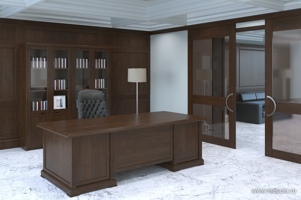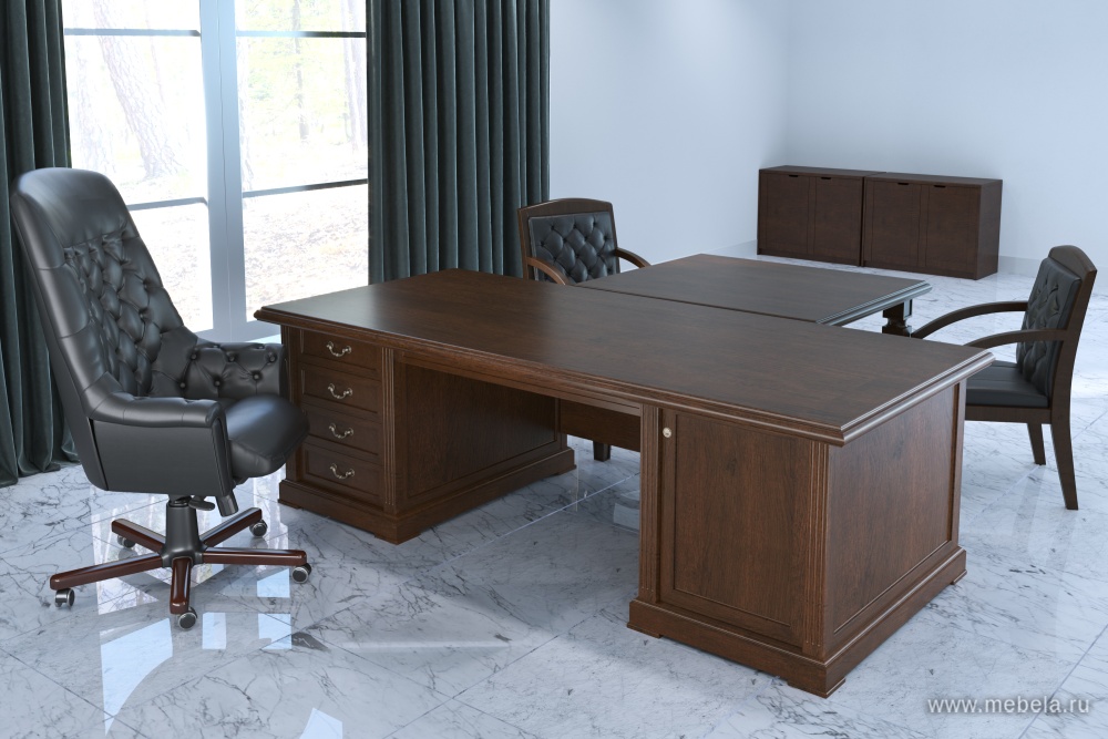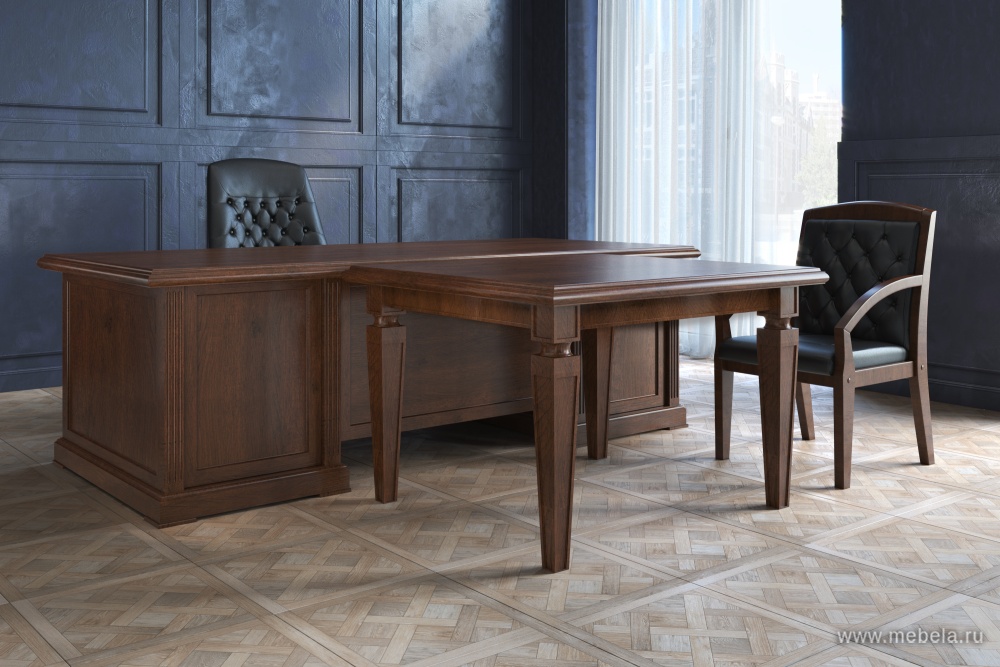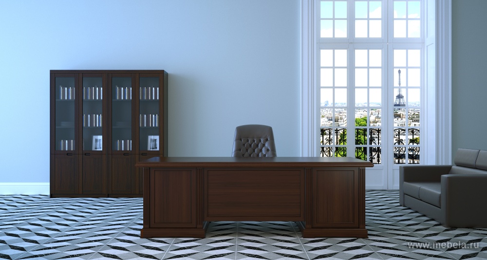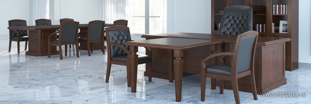 Стильность кабинета подчеркнут бордюры, цоколи и карнизы. Вся мебель данной коллекции изготовлена из массива дерева цвета "темный орех". Кроме того, некоторые элементы выполнены из качественной кожи. В зависимости от размеров помещения и предпочтений заказчика, можно подобрать себе все необходим...