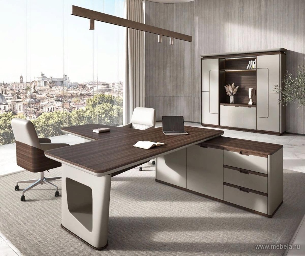 Кабинет Avatar - cовременная классика в сегменте элитной мебели. Массивный, с безукоризненной обработкой стол руководителя отделан элитный кожей и дорогими породами редкого дерева мореный Эвкалипт. Этот теплый цвет одновременно придает таинственность и современность коллекции мебели.