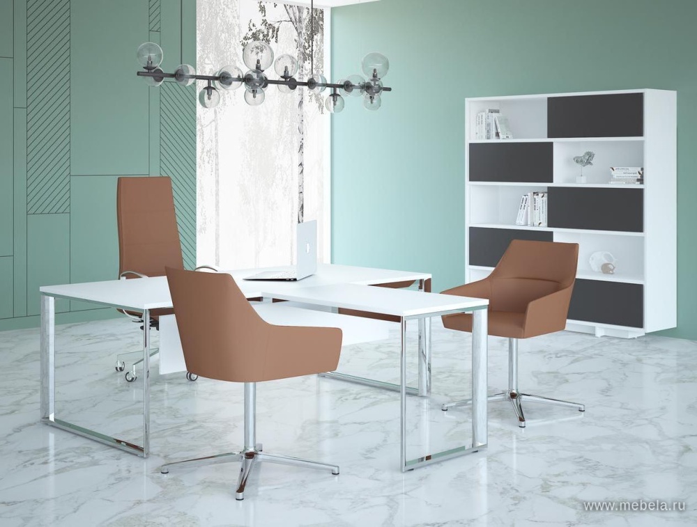 Легкий Хай-Тек стиль мебели для кабинетов Carre достигается совмещением ламинированных панелей с блестящими металлическими каркасами. Все элементы мебели сделаны так, что металлокаркас в основании столов не выглядит громоздко, а только придает легкости офисным решениям.