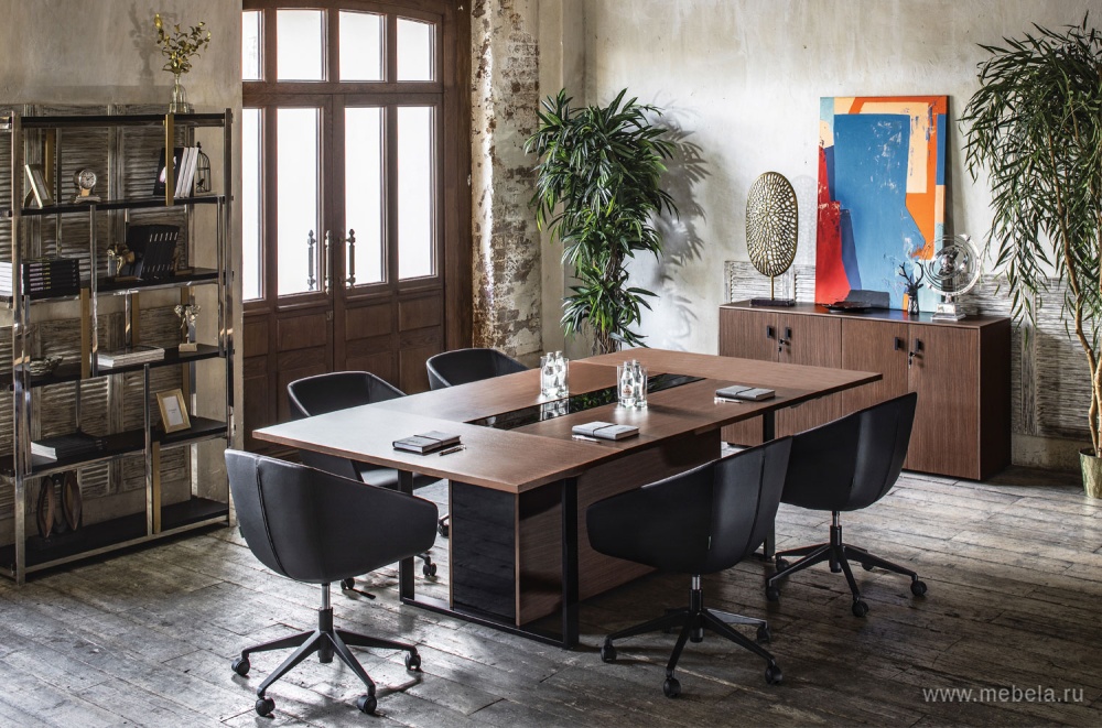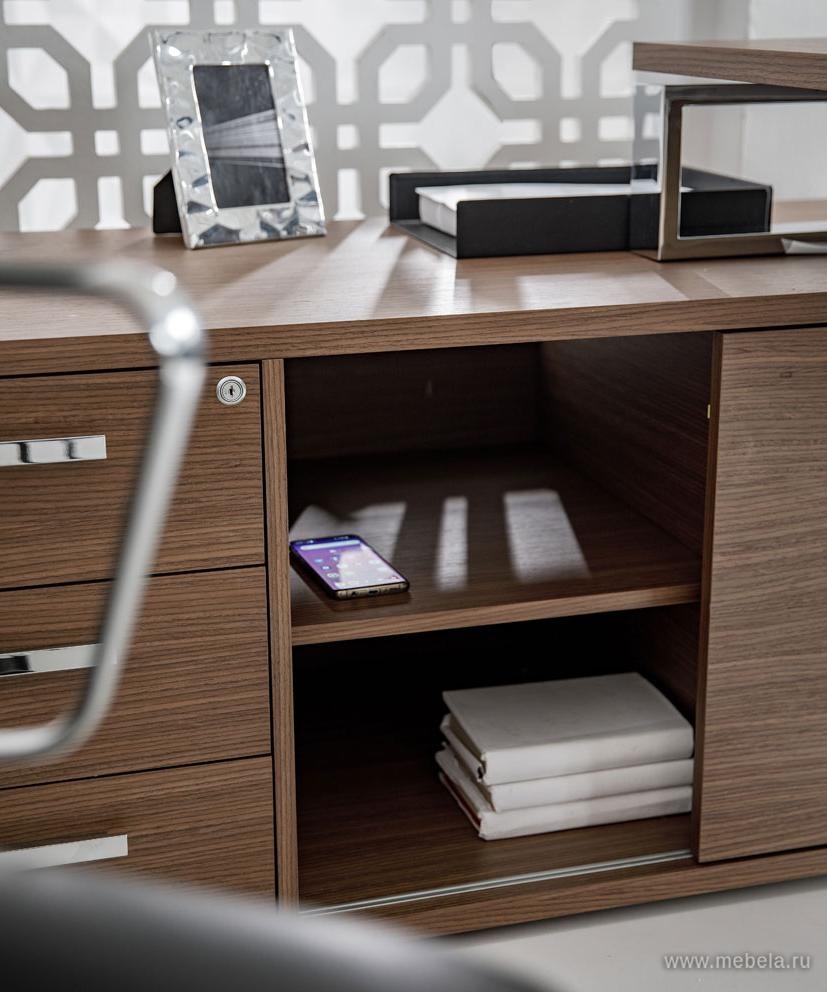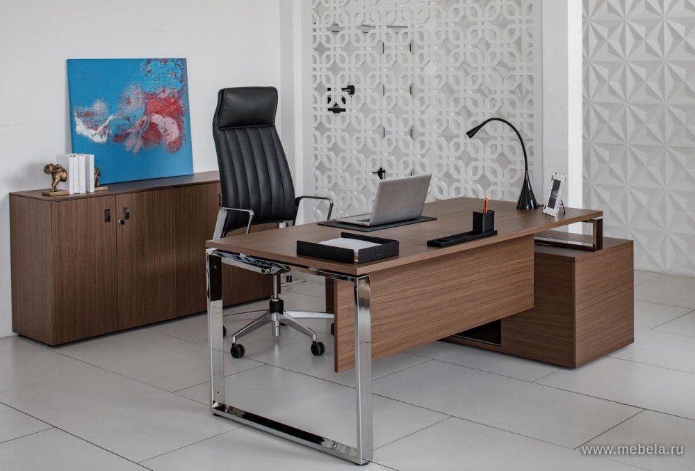 Кабинет руководителя Exe сочетает хромированные элементы с изысканными шпонированными панелями. Несколько вариантов исполнения одних и тех же позиций гарнитура позволяет индивидуально подобрать мебель для каждого конкретного офиса.