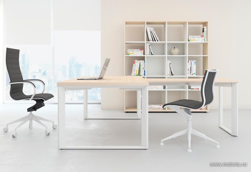Сдержанный кабинет в стиле минимализма: столы из ножек и столешницы, шкафы и тумбы без декора, открытые стеллажи. Выглядит легко, современно и технологично, поэтому подойдет для небольших помещений – мебель с таким дизайном не загромождает пространство, оставляет много свободного места.