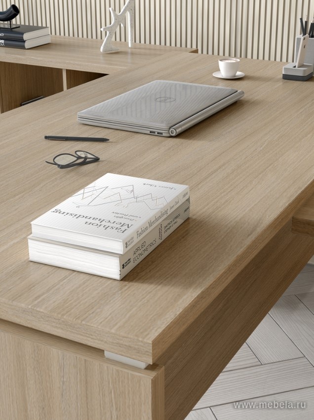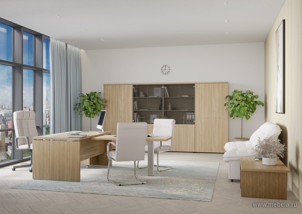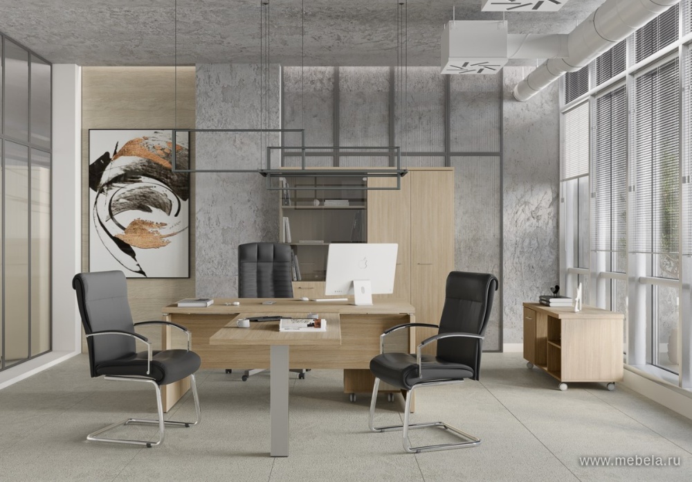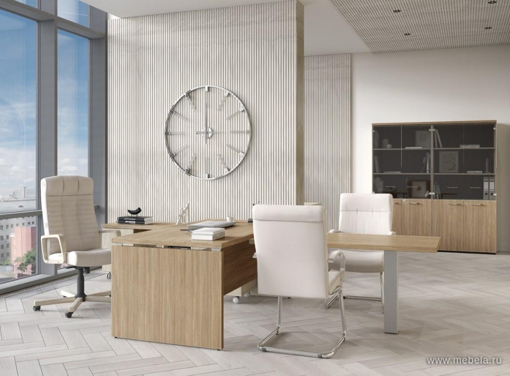 В составе кабинета присутствует модульная линейка переговорных столов на опорах-колоннах из нержавеющей стали, что придает интерьеру современный и стильный вид. Дополнительные элементы, такие как фронтальные и боковые брифинги, журнальные столы, обеспечивают комфорт руководителя.