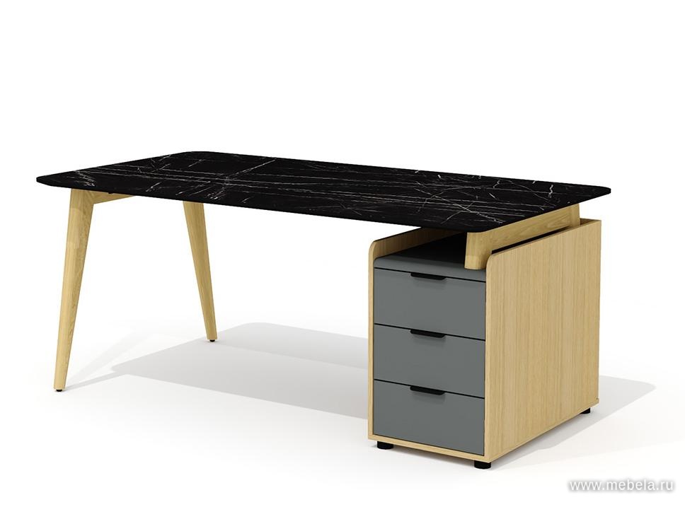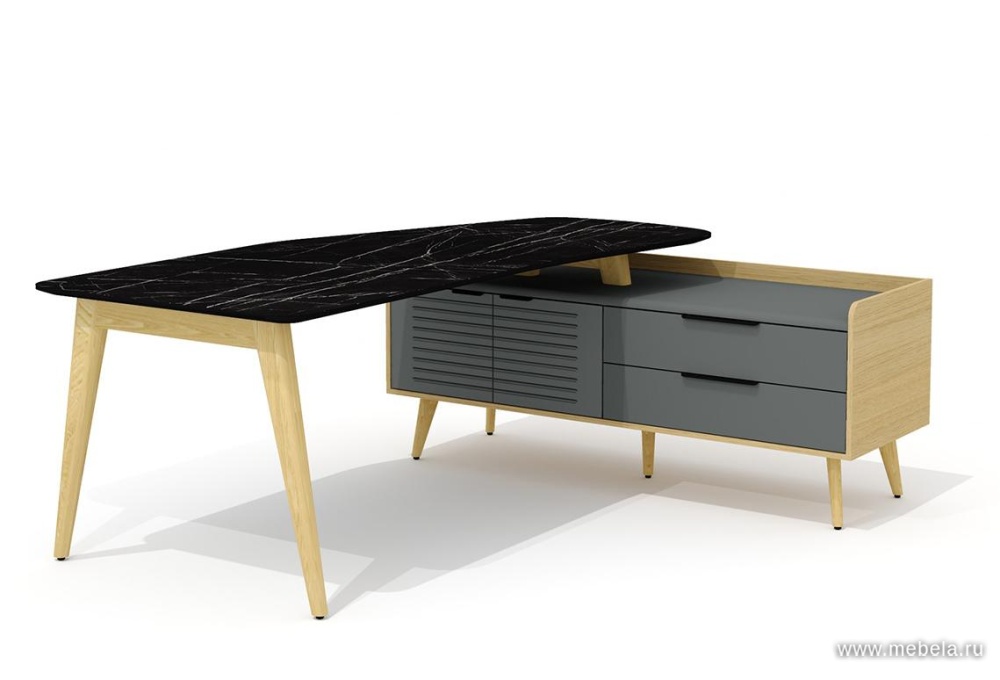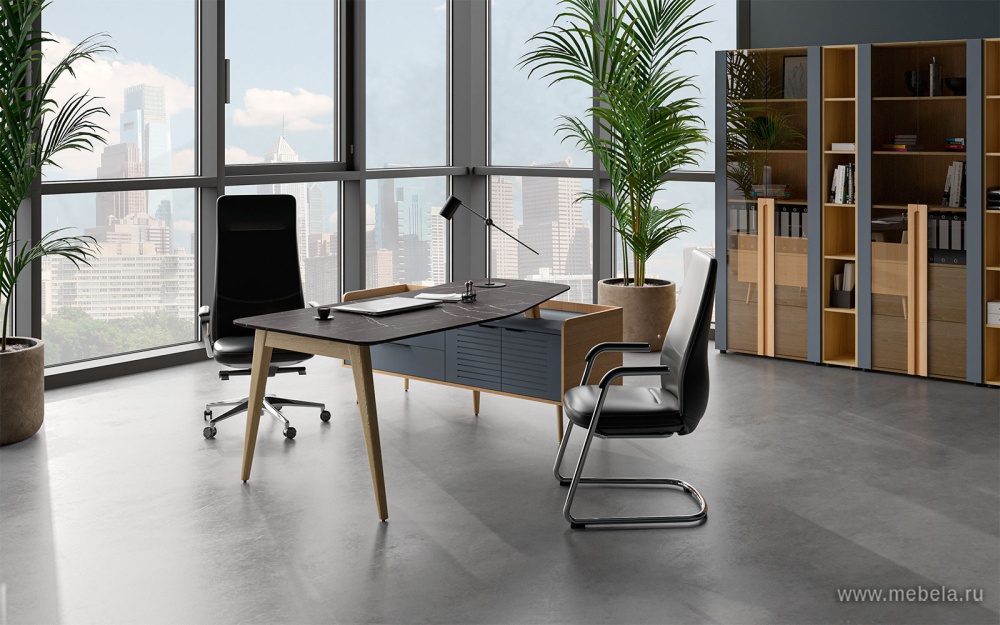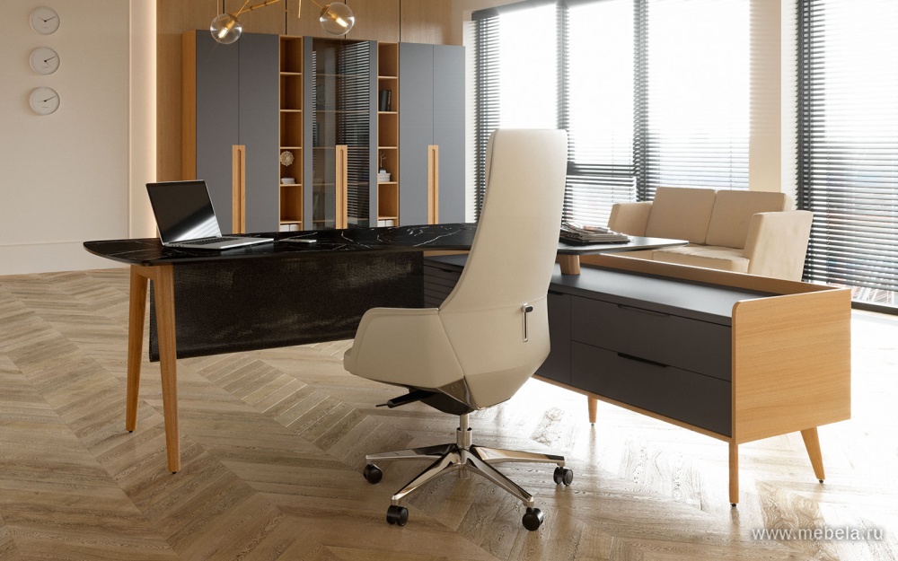 Кабинет руководителя Remo создан на гармоничном сочетании классической тенденции прямоугольных форм и современных решений дизайна в скандинавском стиле. Легкий стол руководителя с изящными деревянными опорами из ясеня, соединённый с массивной рабочей тумбой, вносит яркую необычность и эффектный внешний вид.