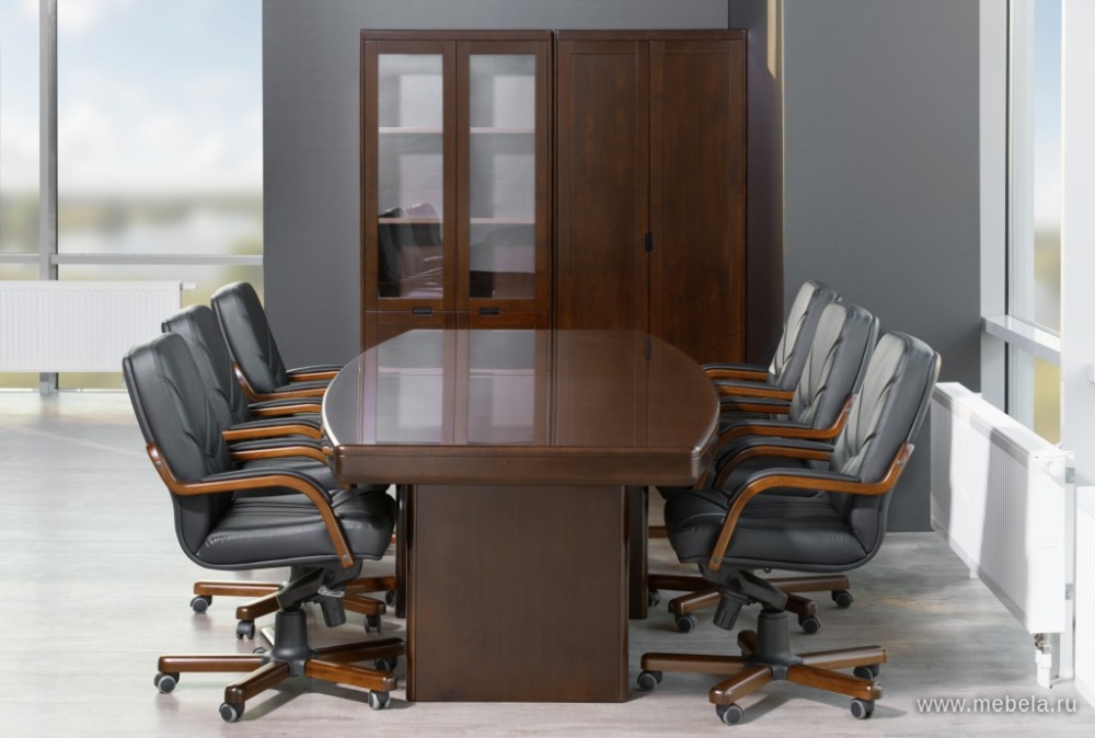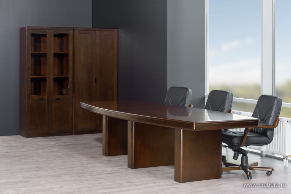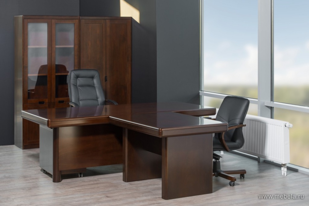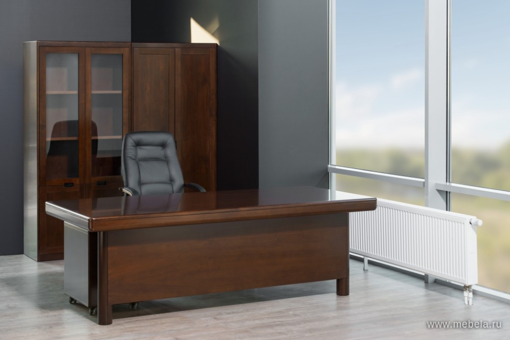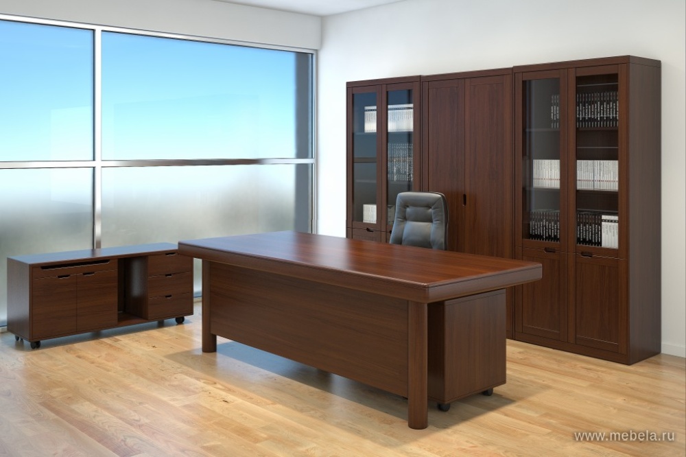 Лаконичная мебель, выполненная в классическом стиле. Все предметы представлены в двух изысканных оттенках: темно-ореховый. Темно-ореховый идеально подойдет для начальника мужчины, а палисандр – для женщины. В минимальной комплектации из письменного стола и шкафа для документов поместится в помещении любого размера.