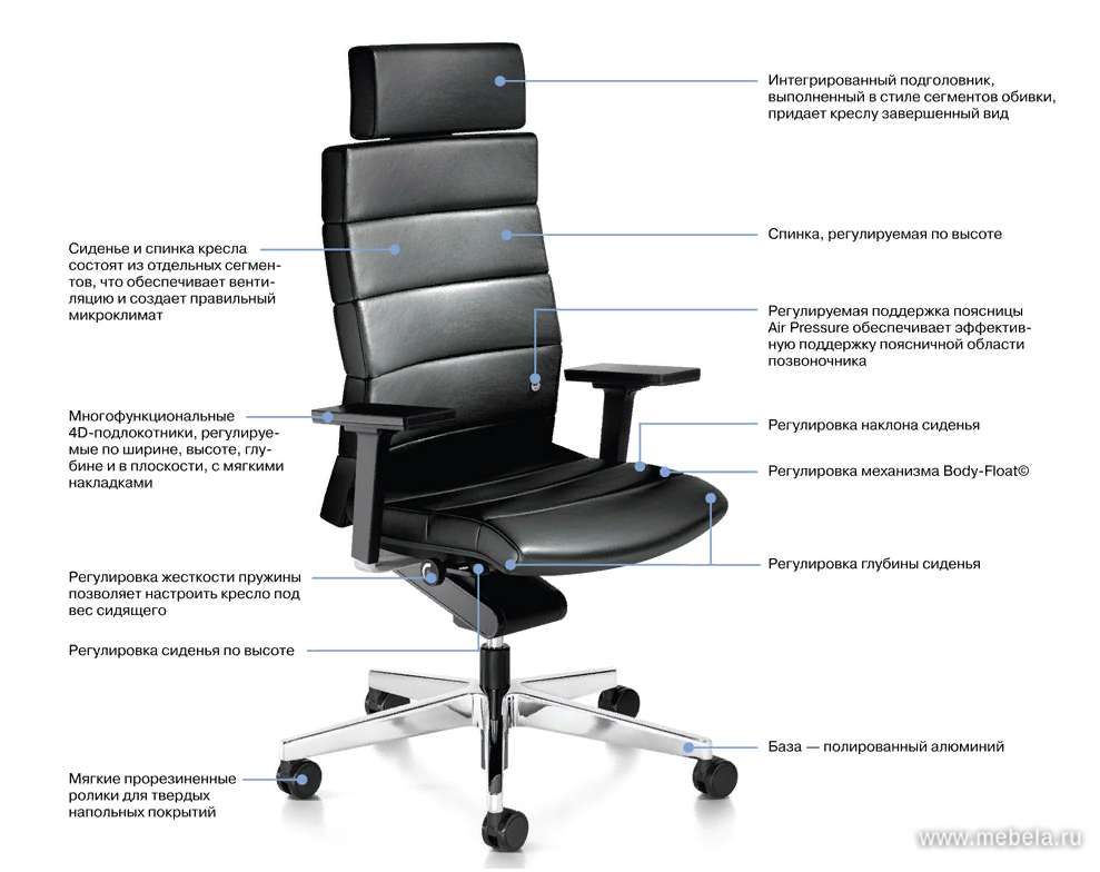 В спинке кресла для руководителей Champ реализована технология Air Pressure, распределяющая воздух для идеально мягкой поддержки поясницы. Патентованный механизм Body-Float отводит спинку вниз при ее наклоне назад, что обеспечивает правильное положение суставам. Прибавьте к этому регулировку жес...