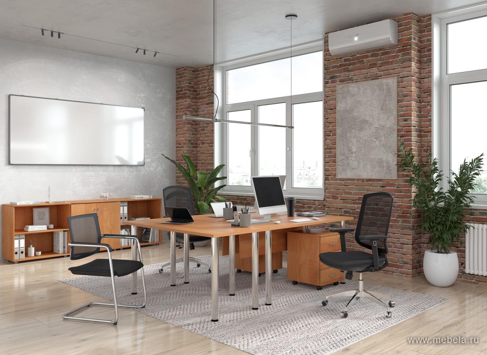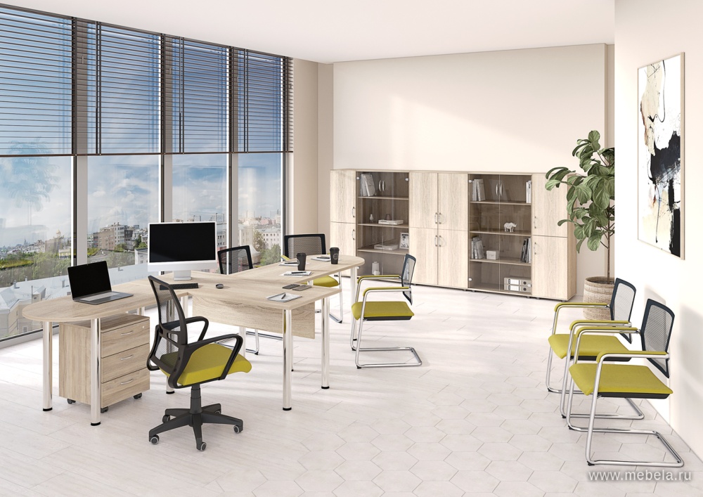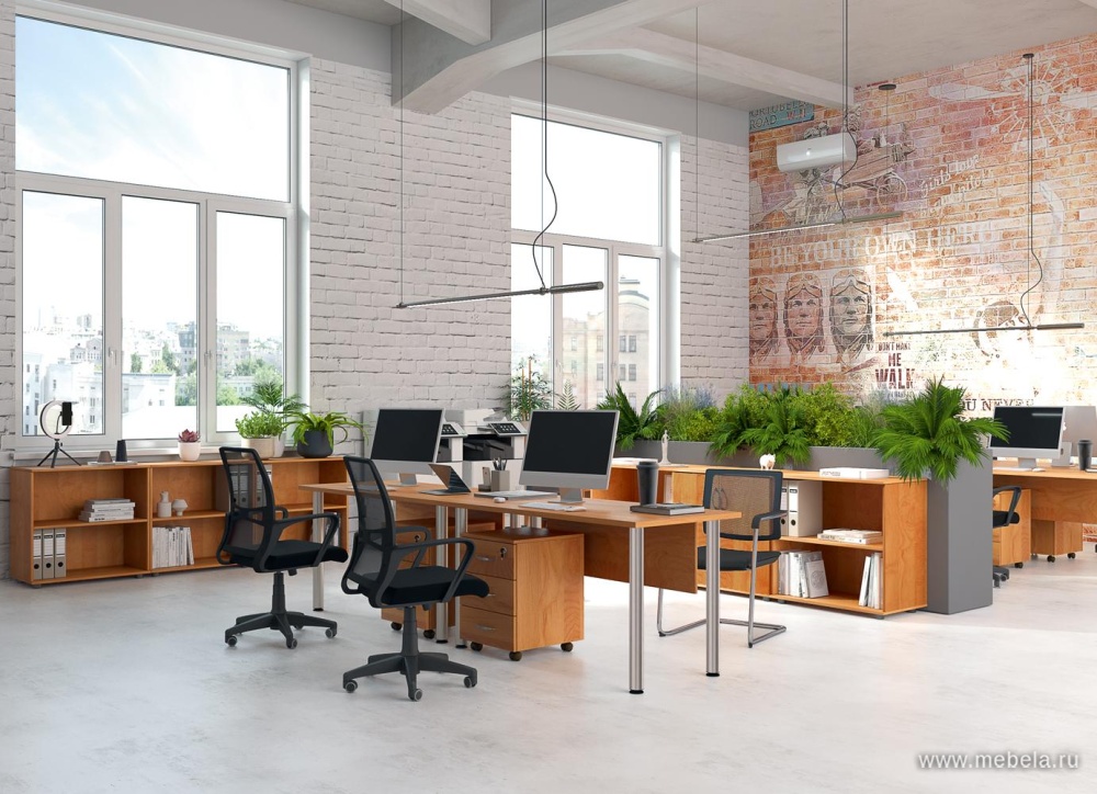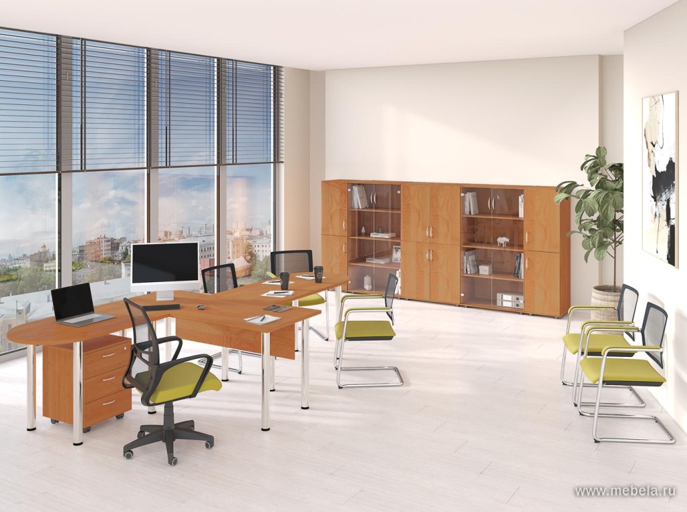 Главной особенностью мебели для офисов Формула МХ в цвете ольха европейская и вяз светлый является возможность создания из нее сложно-комбинированных рабочих зон. Гарнитур представлен самыми разными геометрическими решениями, одинаковыми по высоте, способными быть объединенными друг с другом по воле заказчика.