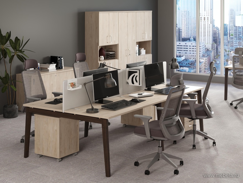 Это универсальное решение для обустройства офисного пространства типа «open-space» в прямых и четких линиях строгого и лаконичного дизайна. Мебель включает модельный ряд столов на опорах из массива дуба и настольные перегородки с матовым стеклом, которые создают демократичную и продуктивную рабочую атмосферу.