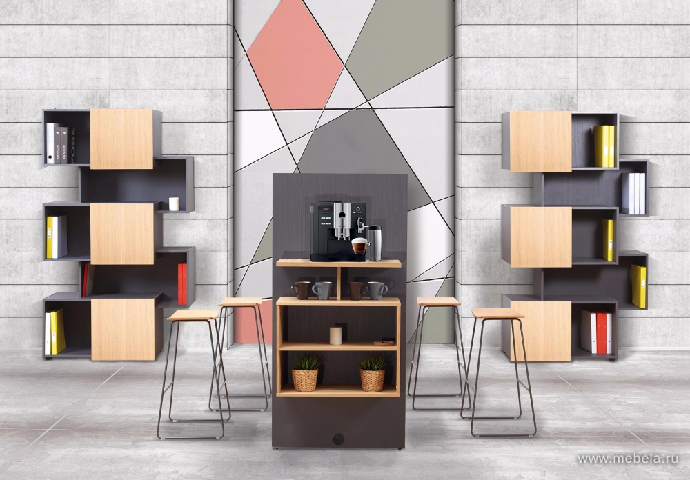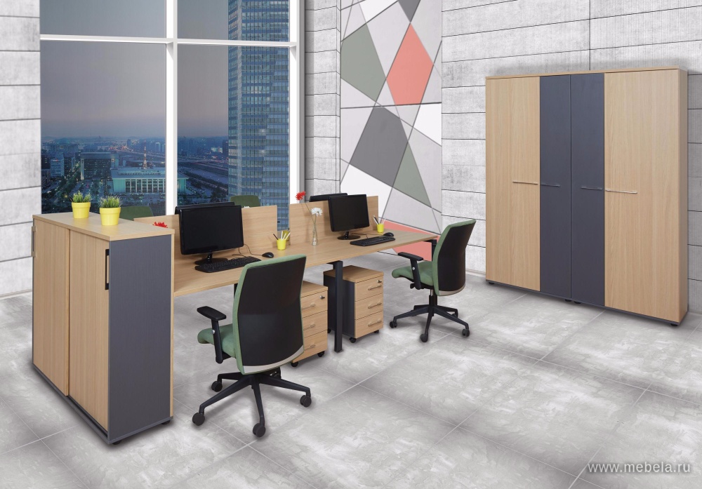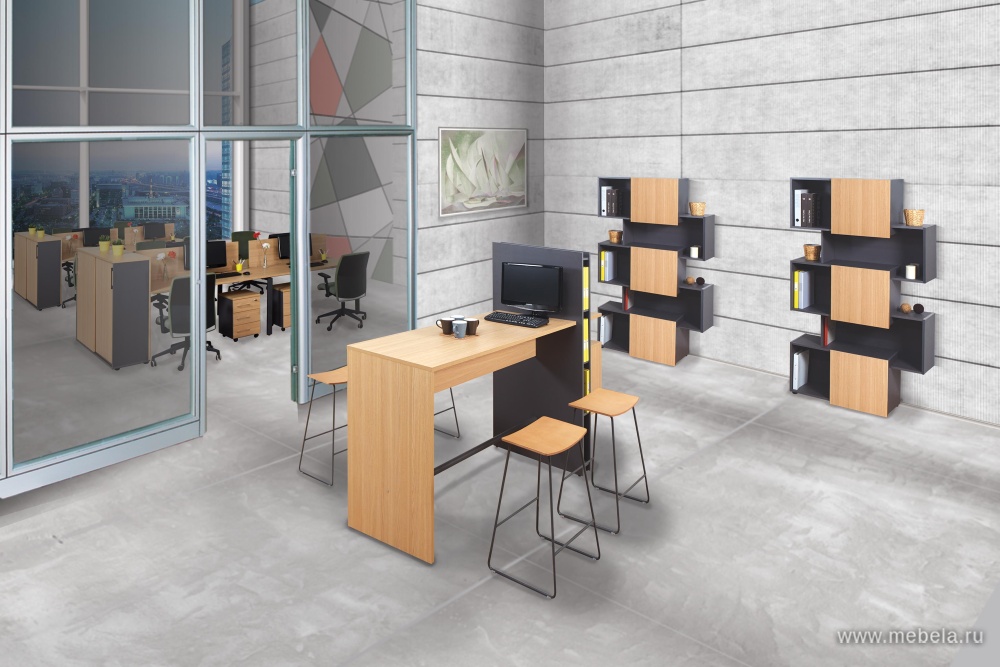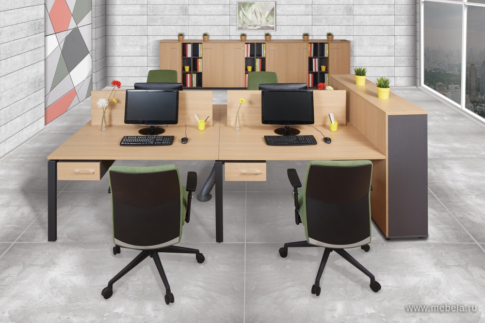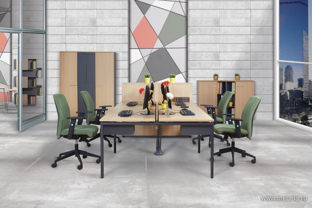Комплект этой мебели для персонала подтверждает, что можно обставить офис очень изысканно в минималистическом стиле. Контраст темного и светлого цветов, динамичная форма полок и хранилищ для файлов вместе с многофункциональными столами создают неповторимый образ.