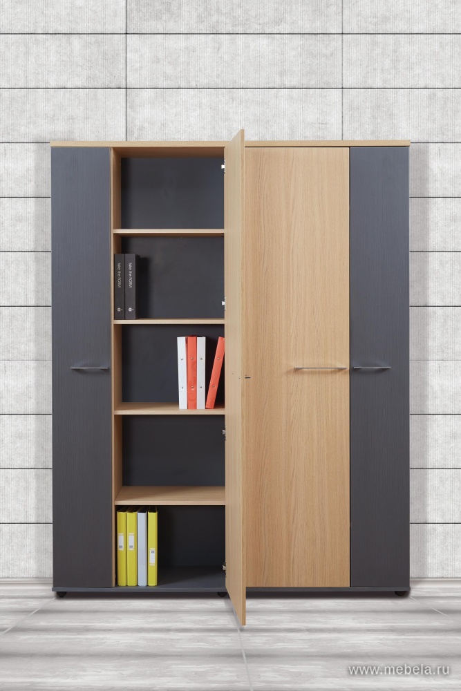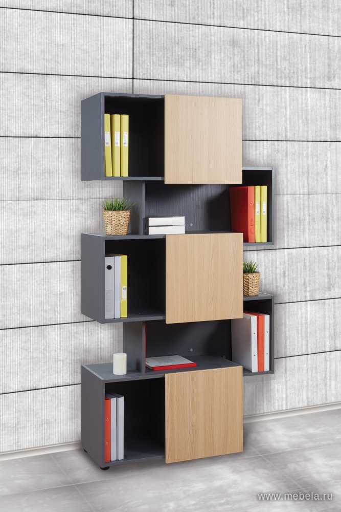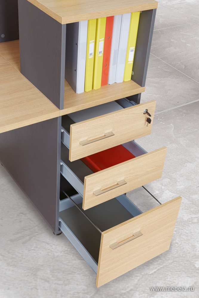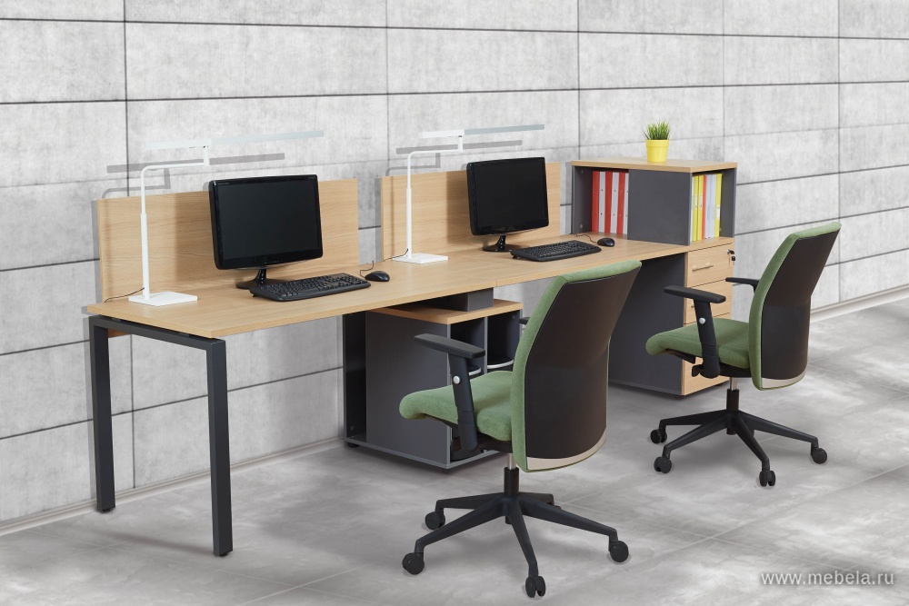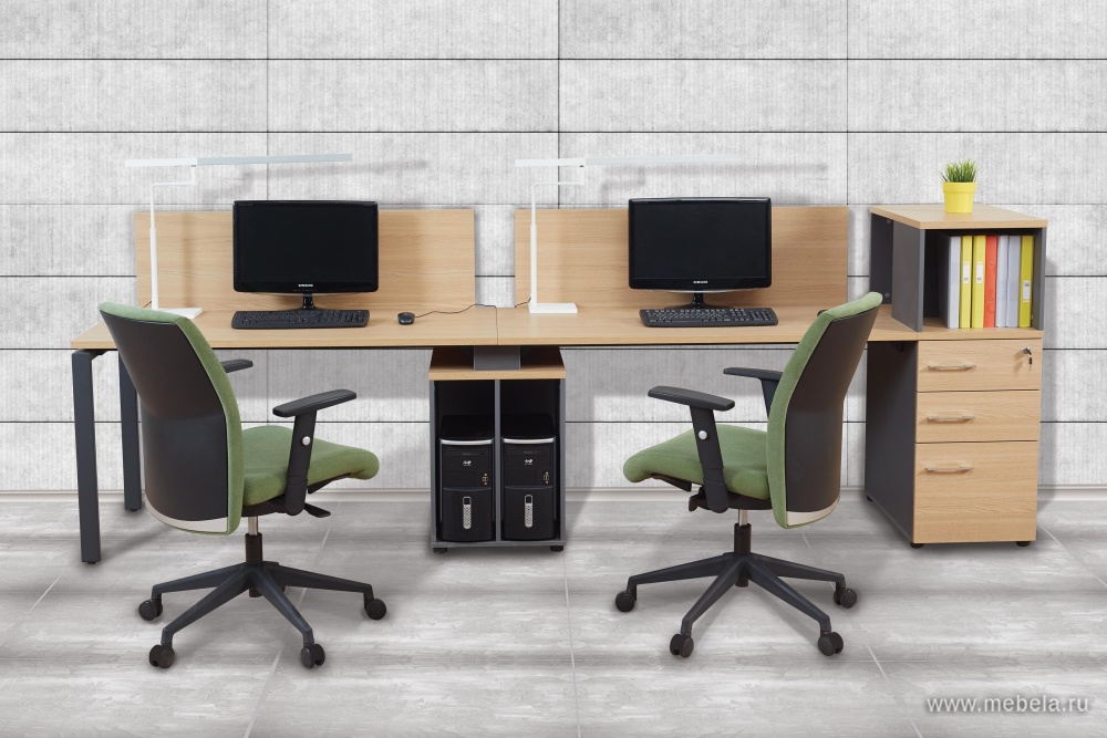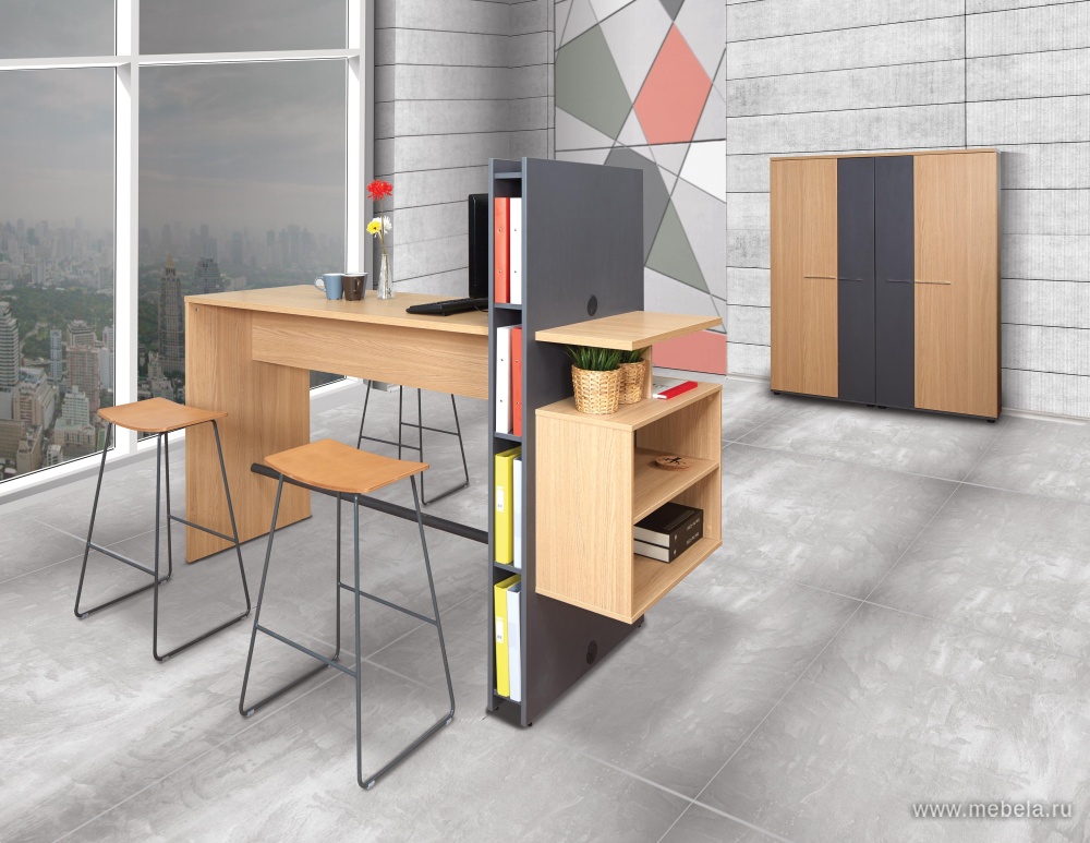 Комплект этой мебели для персонала подтверждает, что можно обставить офис очень изысканно в минималистическом стиле. Контраст темного и светлого цветов, динамичная форма полок и хранилищ для файлов вместе с многофункциональными столами создают неповторимый образ.