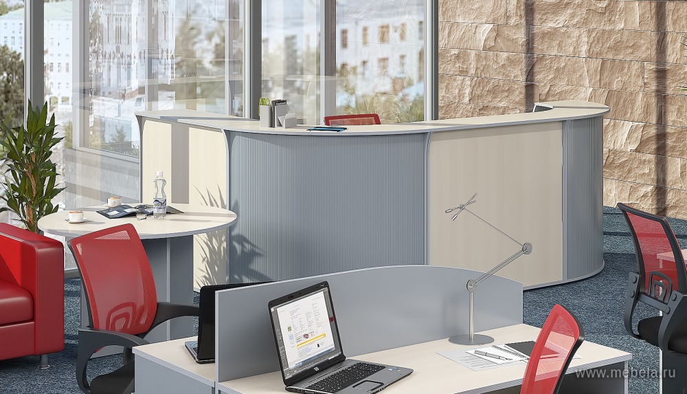 Сочетание контрастов цветов и материалов в стойках ресепшн Имаго NEW создают современный Хай-Тек стиль для любого офиса. Наборные панели жалюзийного типа и обычный ламинированный ДСП создают высокотехнологичный образ, подчеркивающий современность вашей компании.