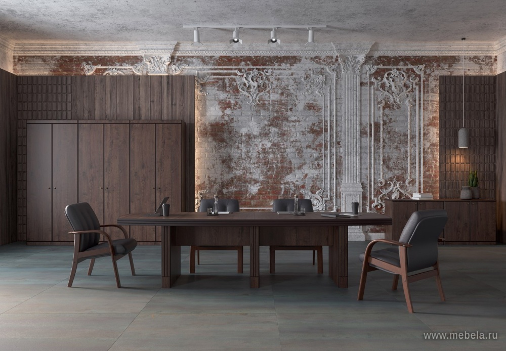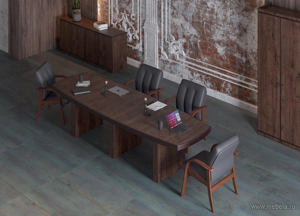 Вместительный трехметровый стол для переговоров Capital прекрасно подойдет для оборудования приемных руководителей высшего звена. Его стиль убедительно и без лишней мишуры заявляет о своей респектабельности с помощью палисандрового цвета материалов и предельно массивной столешницы с изящными зак...