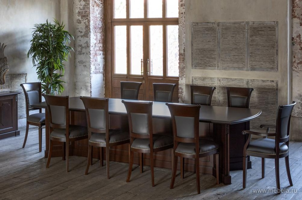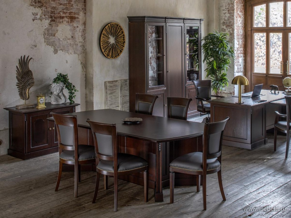 Классическая итальянская ручная работа от мастеров с Апеннинского полуострова воплотилась в столах для переговоров Doge. Здесь уникально все – начиная от резьбы ручной работы и заканчивая редким на рынке офисной мебели орехом Танганьика, таким популярным в интерьерах Италии.