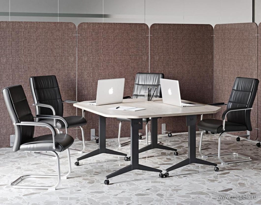 Инновация мебельной индустрии: столы с лаконичным и стильным дизайном и с усовершенствованным устройством механической трансформации. Мобильные складывающиеся столы помогут быстро оборудовать помещение офиса под текущие нужды: создать отдельные рабочие места, большой конференц-стол. Можно сложить столы на хранение.