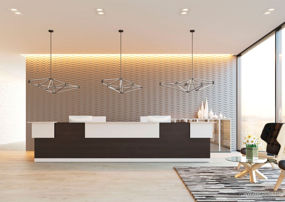 Дизайнерам стойки ресепшн РИО удалось с помощью простых форм достигнуть оригинального собственного стиля. Все благодаря контрастным накладным элементам на лицевых панелях. Именно они за счет сочетания цветов и объема обеспечивают отличный современный стиль этой стойке.